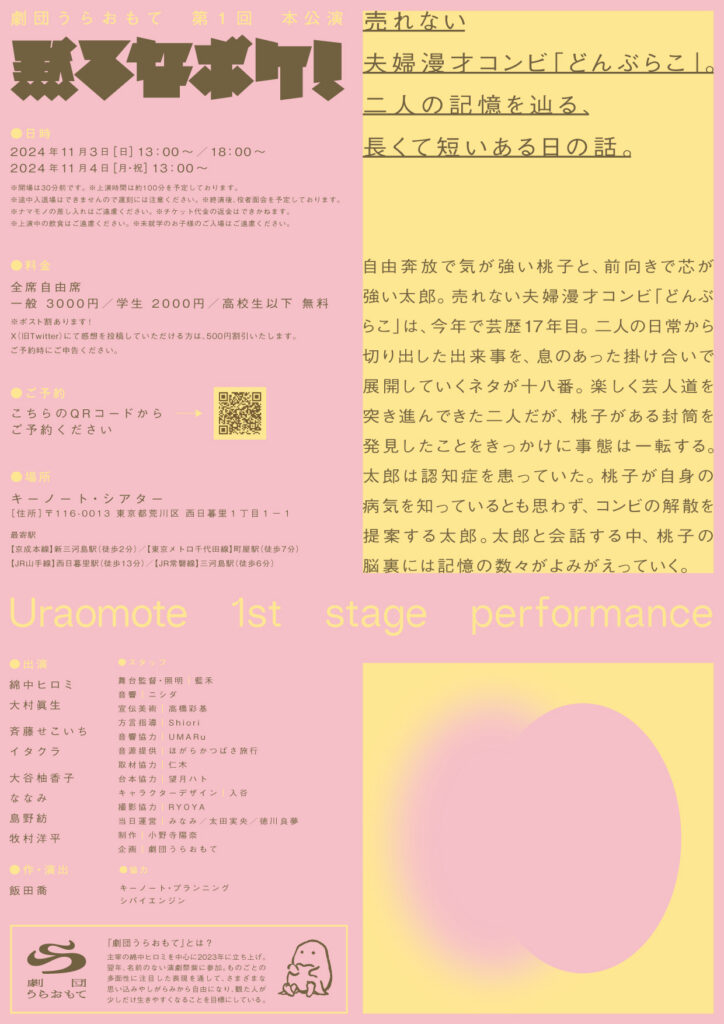 ※ポスト割があります。アカウントを事前申告の上、#黙るなボケ or #劇団うらおもて をつけて感想をポストいただける方に500円割引いたします