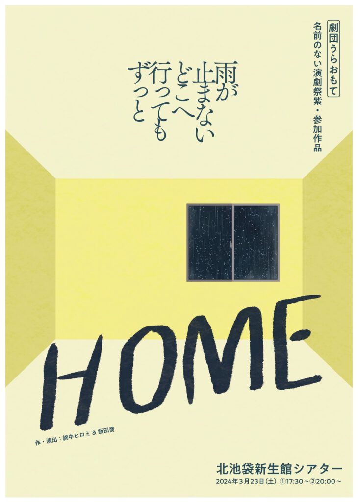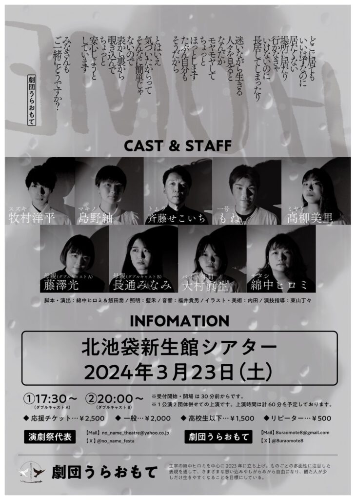 名前のない演劇祭紫 参加作品 HOME 2024/4/23(Sat) :17:00~(open 18:30~) 20:00~(open 19:30~) STORY とあるシェアハウスにスズキという青年がやってきて・・・。 人それぞれの居場所を描く、うらおもて初の作品。 GALLERY INFO Schedule ●2025/4/5(Sat) 17:00~(open 16:30~) 20:00~(open 19:30~) Place 北池袋新生館シアター Back
